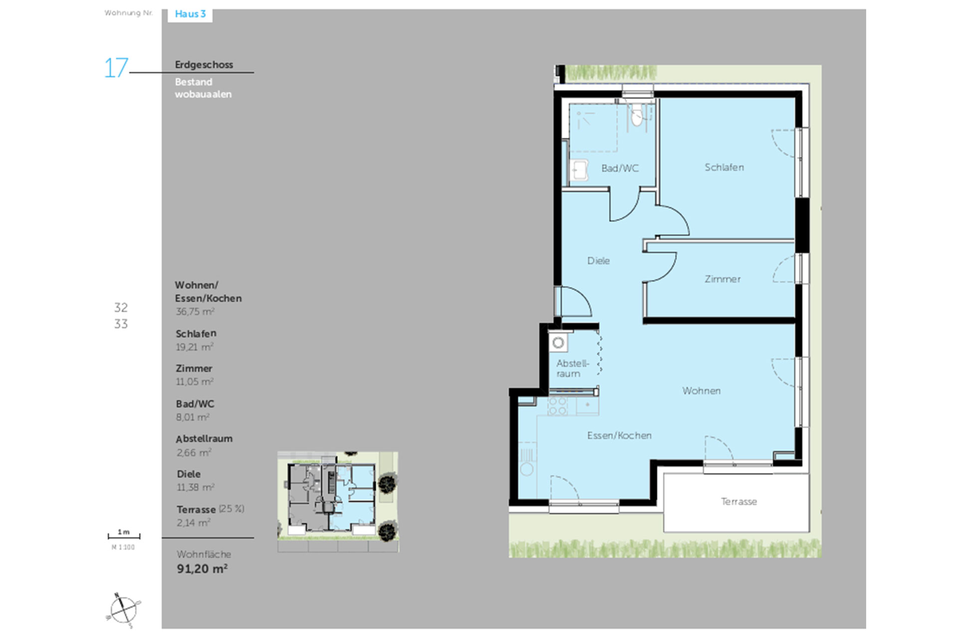 Grundriss Wohnung Nr. 17 im Erdgeschoss von Haus 3 mit 91,20 m² Wohnfläche, bestehend aus Wohnen, Essen/Küche, Schlafzimmer, Zimmer, Bad/WC, Diele, Abstellraum und Terrasse