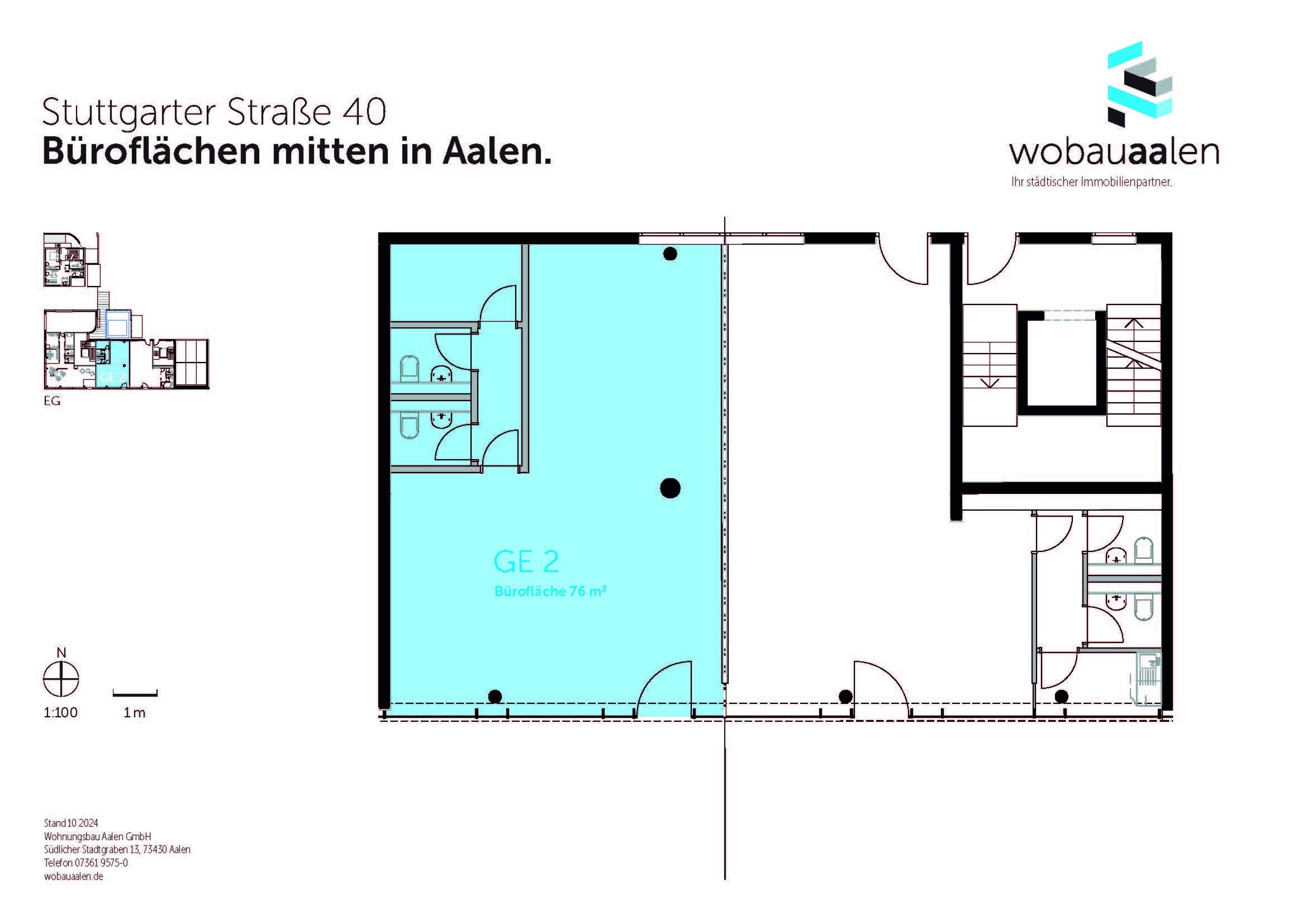 Die Büroflächen befinden sich in der Stuttgarter Straße 40, mitten im Herzen von Aalen. Diese zentrale Lage bietet eine hervorragende Anbindung an die städtische Infrastruktur sowie eine hohe Sichtbarkeit. In direkter Nähe befinden sich zahlreiche Geschäfte, Restaurants und öffentliche Verkehrsmittel, was die Attraktivität dieses Standortes weiter steigert.