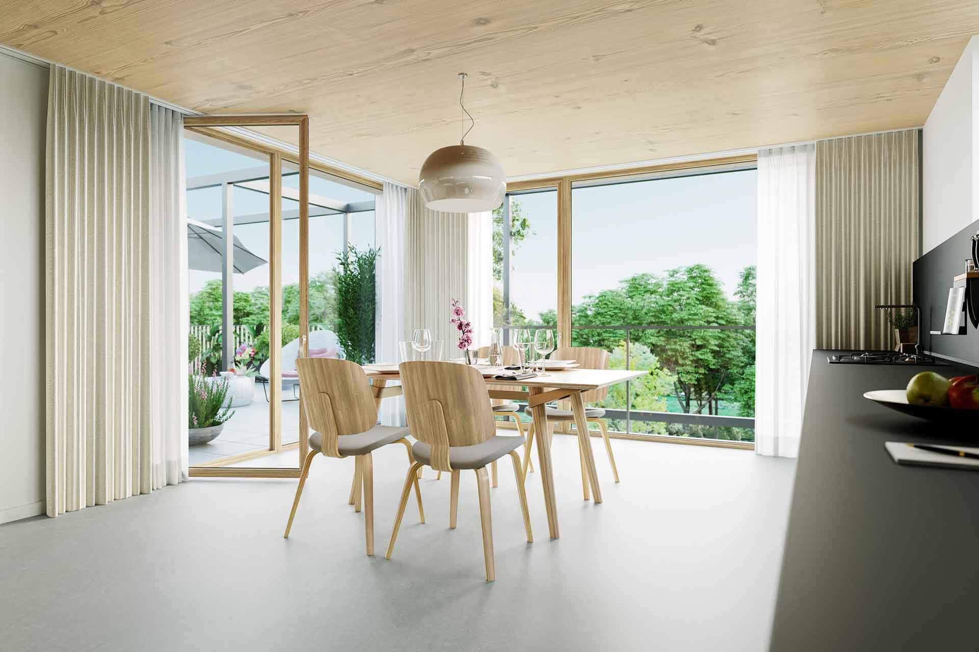 Holzhäuser geben im Vergleich zu konventionellen Gebäuden die Wärme langsamer nach außen oder innen ab. Deshalb ist Holz ein idealer Baustoff für die Umsetzung von Effizienz-Häusern mit niedrigem Energiebedarf. Das angenehme und gesunde Raumklima der Wohnungen wird Sie begeistern.