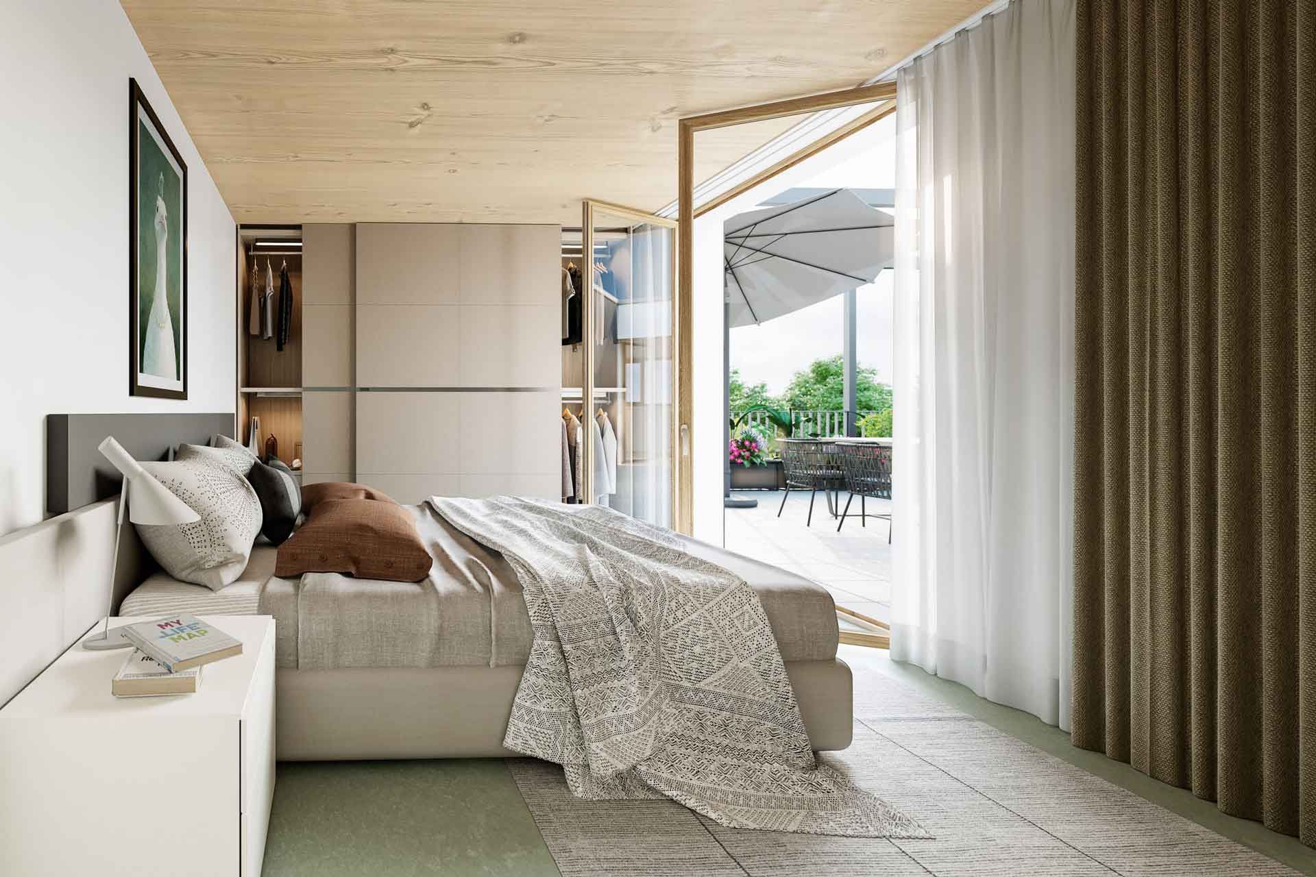 Bei der Innenausstattung der Wohnungen liegt der Fokus auf modernen und wertbeständigen Materialien. Großzügige, dreifach verglaste Fenster mit elektrischen Rollläden sorgen für optimalen Schallschutz und eine gute Wärmedämmung und laden dazu ein, den Blick auf die herrliche Landschaft zu richten. Ein Aufzug ermöglicht den barrierefreien Zugang in alle Wohneinheiten. Für jede Wohnung seht ein Parkplatz zur Verfügung, zudem Fahrradstellplätze vorhanden sind. Für eine maximale Gestaltungs-freiheit besitzen alle Räume eine komfortable Fußbodenheizung.